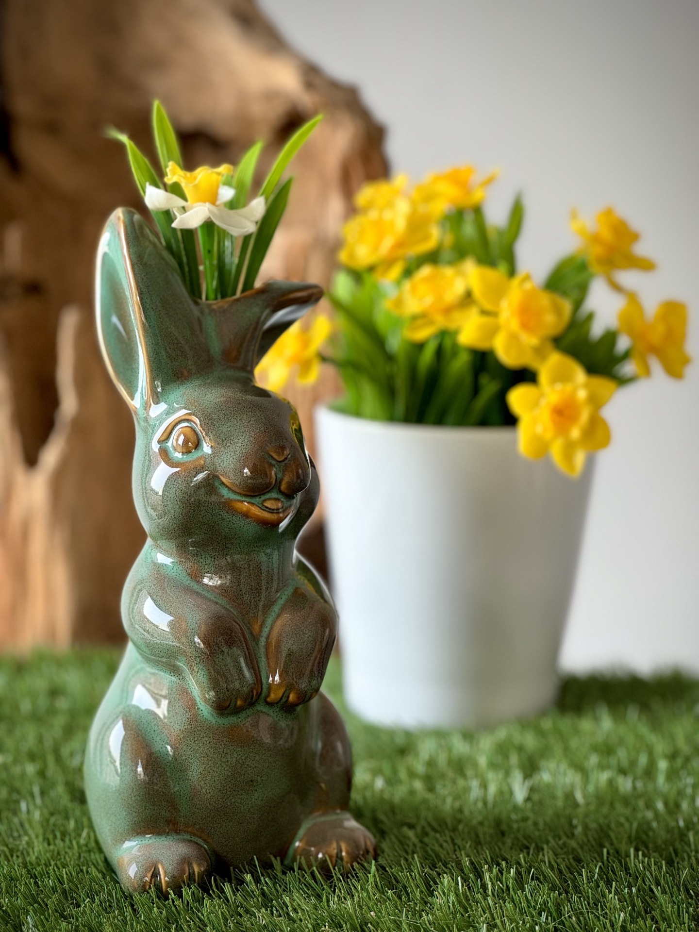 Deze paashaas is gemaakt van porselein en is zeer gedetailleerd afgewerkt. Het beeld is niet vorstbestendig maar wel uv-proof, hierdoor is dit beeld geschikt voor zowel binnen als buiten (niet in de wintermaanden). Het beeld is licht van gewicht, maar toch zwaar en stabiel genoeg om sterke windstoten te trotseren. Eenvoudig schoon te houden.