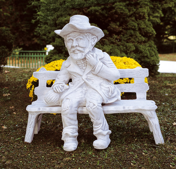 Deze oude man op bankje is volledig vervaardigd uit witte betonsteen en behandeld met een waterafstotend product. Dit product zorgt ervoor dat groenaanslag geen kans krijgt om zich vast te hechten aan het beeld, ook regendruppels parelen netjes van het beeld af zodat het geen water opzuigt in de poriën.