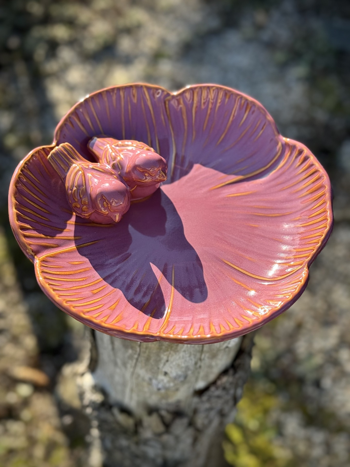 Deze vogeltjes op vogelbadje/vogelvoederschaal zijn volledig gemaakt van keramiek.